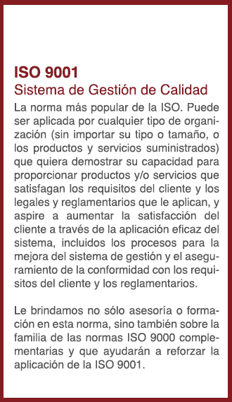- Cursos de interpretación y para auditores internos (basado en ISO 19011) en el sistema de gestión de la calidad.