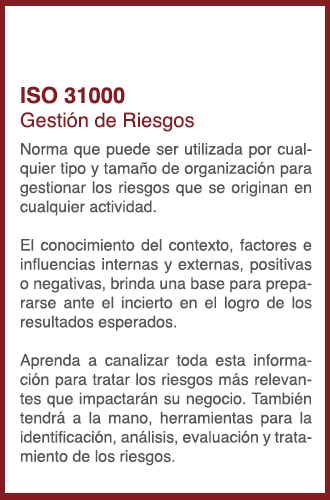 - Curso sobre Gestión de riesgos (basado en ISO 31000 y Guía 73) para la implementación de las normas de gestión.